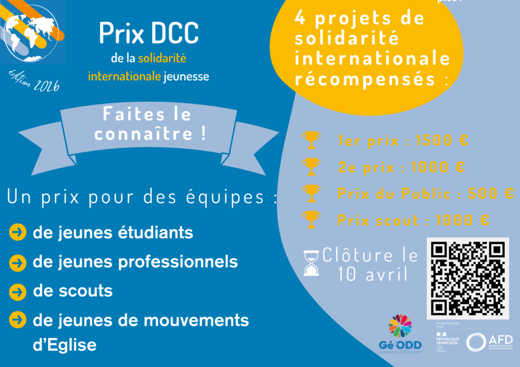 Le Prix DCC de la solidarité internationale est un concours lancé par la Délégation Catholique pour la Coopération. Ouvert à tous les groupes d'étudiants, de scouts, de jeunes pros et de membres de mouvements de jeunesse de l'Église, il récompense quatre projets de développement au profit d'un partenaire du Sud au cours de l'année 2026.