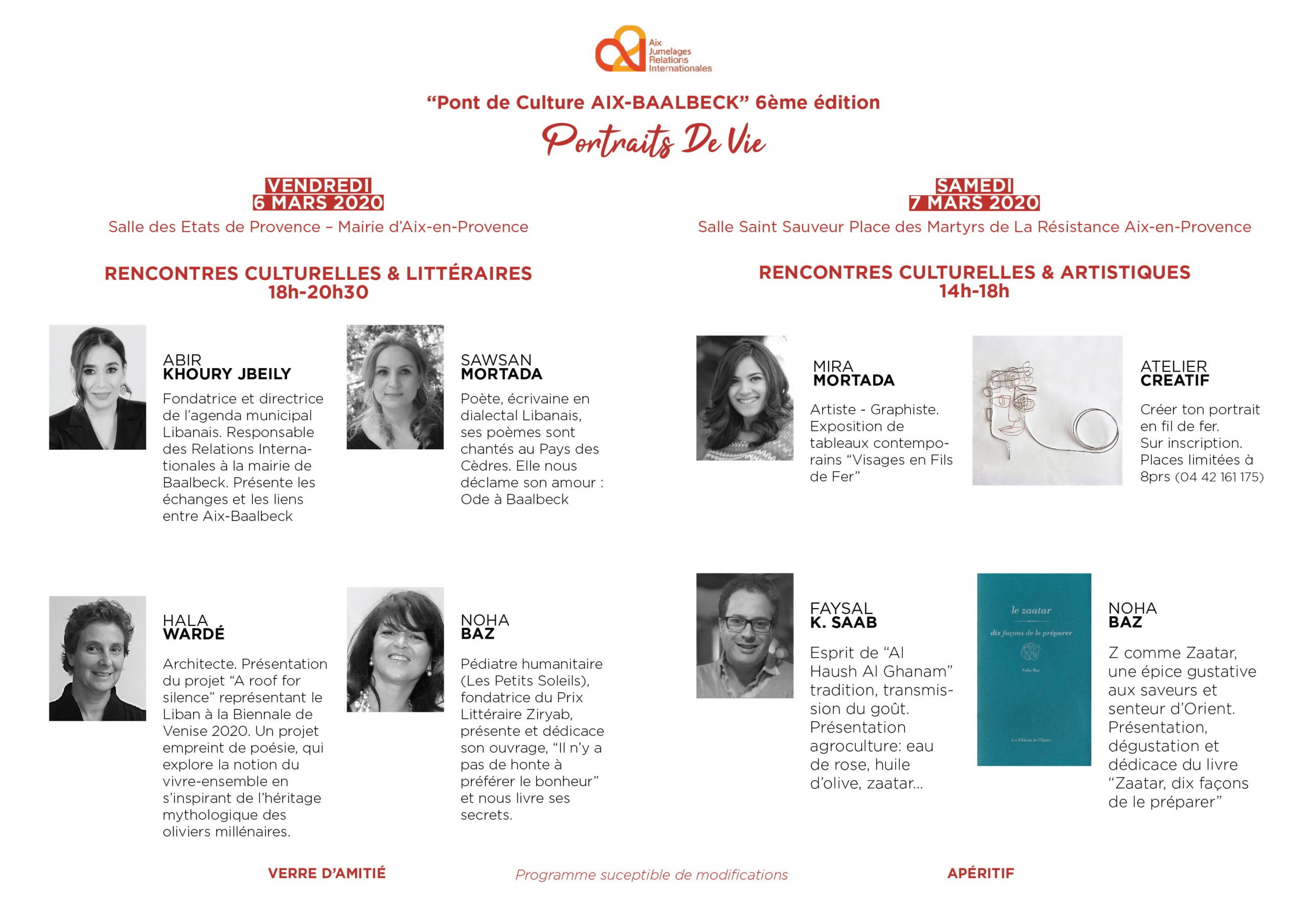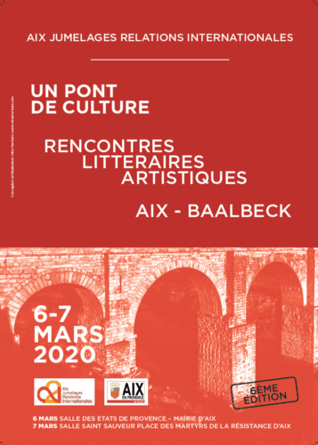 Dans le cadre du jumelage entre Aix et Baalbeck, l’Association des Jumelages et des Relations Internationales d’Aix-en-Provence organise les 6ème Rencontres culturelles, littéraires, artistiques et agro-culture libanaises francophones, intitulées : «Pont de Culture Aix-Baalbeck, PORTRAITS DE VIE».