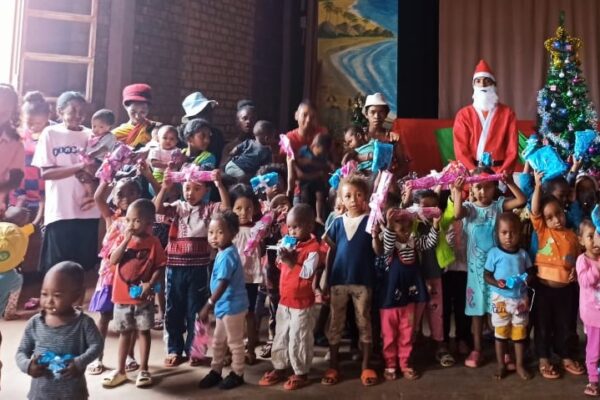Distribution des cadeaux de Noël pour une centaine d'enfants de 2 ans à 8 ans, des enfants issus d'une famille en difficulté à Ambohimirary Ampasapito Madagascar.